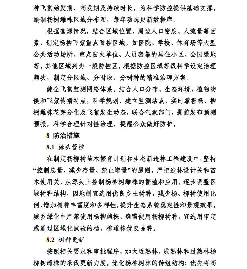 在源头管控方面,方案要求优化绿化结构,严控杨柳雌株增量。新建项目严禁使用杨柳雌株,优先选用乡土树种和无絮雄株;城市上风口及重点防治区域禁止集中连片栽植杨柳雌株。同时,逐步消减雌株存量,重点改造飞絮片林,将老、病、残杨柳雌株更替为无絮树种,并因地制宜完善乔灌木草复合结构,增强绿地吸附飞絮的能力。