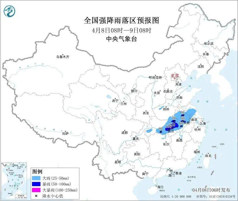 预计,4月8日8时至9日8时,湖北南部和东部、安徽中北部、河南南部、江苏中北部等地部分地区有大到暴雨,其中,湖北东部局地有大暴雨(100~150毫米)。上述部分地区伴有短时强降水(最大小时降雨量20~40毫米,局地可超过50毫米),局地有雷暴大风或冰雹等强对流天气。