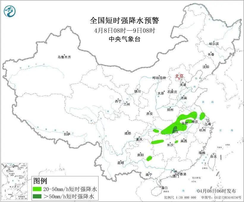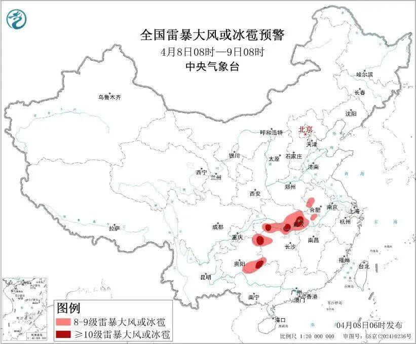 预计4月8日8时至9日8时,江汉、江淮西部、江南北部、西南地区东部等地的部分地区将有8级以上雷暴大风或冰雹天气,其中,湖北东部和南部、湖南西部、重庆东南部、贵州东南部等地的部分地区将有10级以上雷暴大风,最大风力可达11级以上;湖北东部和南部、安徽中北部、江苏中部、河南南部、湖南北部等地的部分地区将有小时雨量大于20毫米的短时强降水天气,其中,湖北东部局地小时雨量大于50毫米。