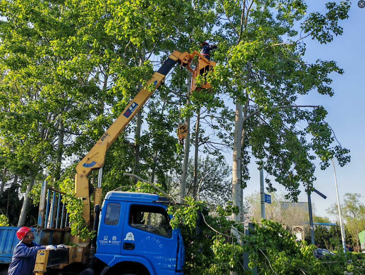 “修剪就像给树‘理发’,既要减少飞絮,又不能伤着树。”一位正在高空作业车上修剪树枝的工人师傅说。作业中,他们兼顾树形美观与生态平衡,实现了“减絮”与“护绿”的统一。