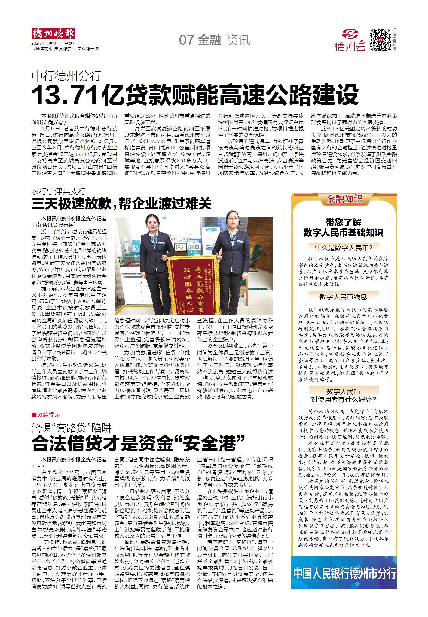 德州晚报全媒体讯 4月9日,记者从中行德州分行获悉,近日,该行向高德公路建设(德州)有限公司发放固定资产贷款1.5亿元。截至今年2月,中行德州分行对该企业累计支持金额已达13.71亿元,专项用于支持高青至武城高速公路商河至平原段项目建设。该项目是山东省“四横五纵沿黄达海”十大通道中鲁北通道的重要组成部分,也是德州市重点推进的基础设施工程。