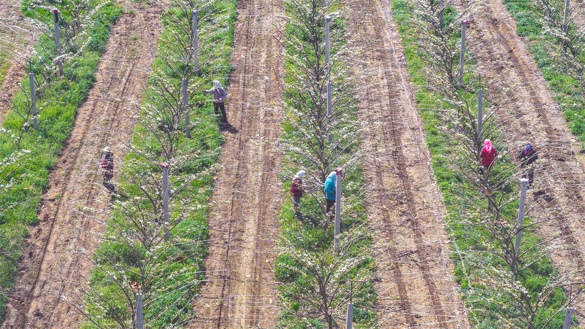 ▲4月7日,大白张村村民在为梨花授粉。