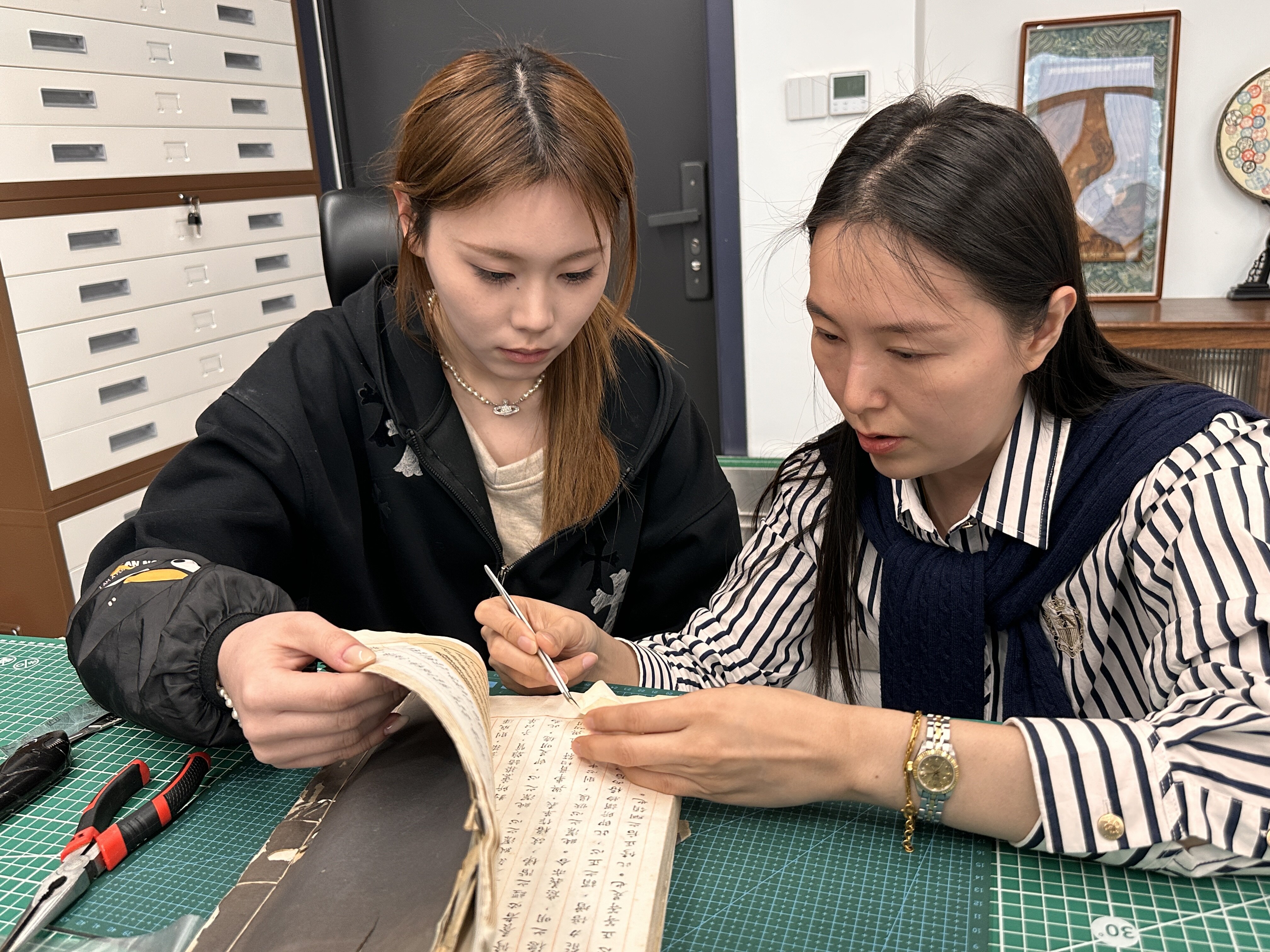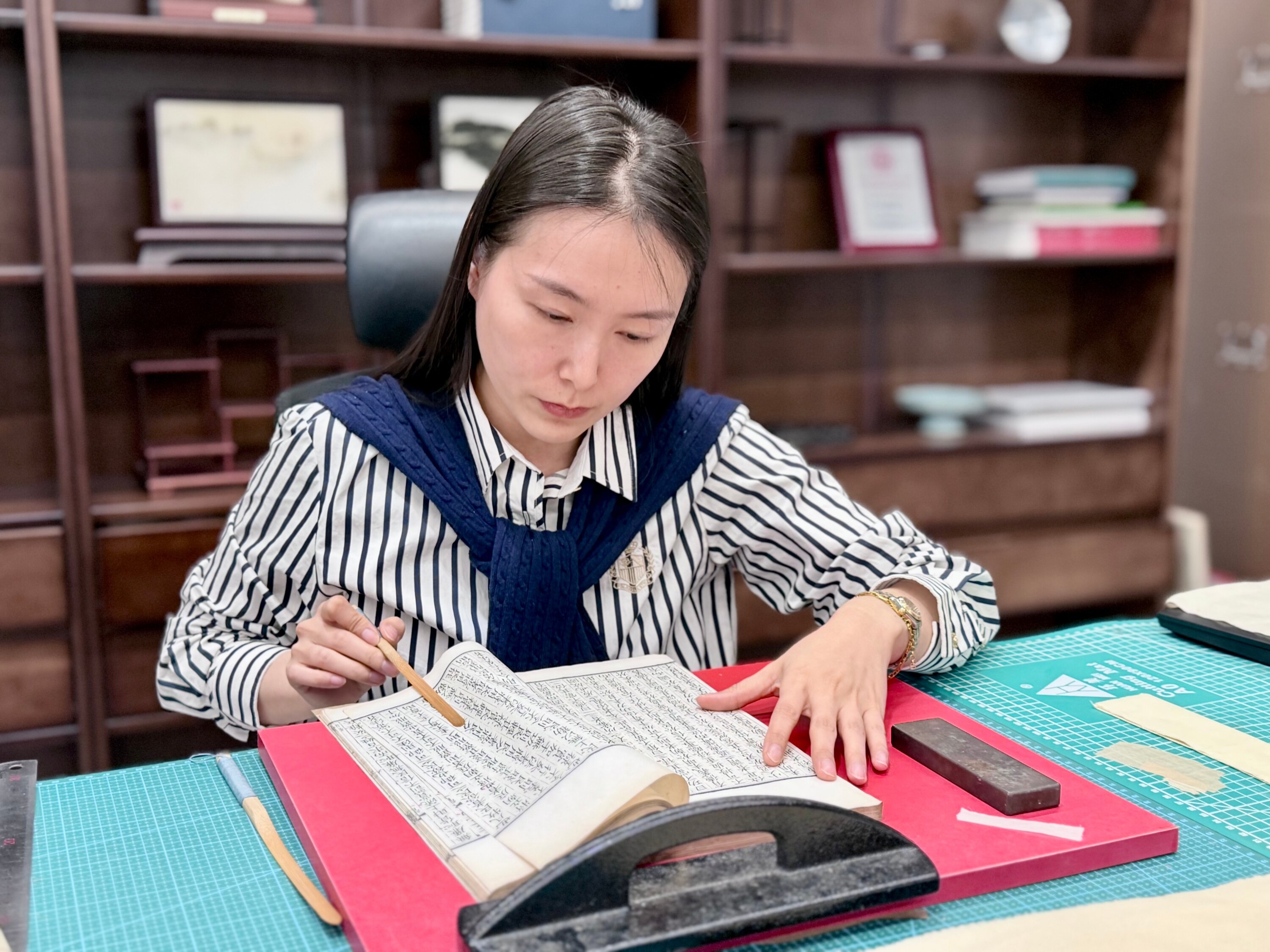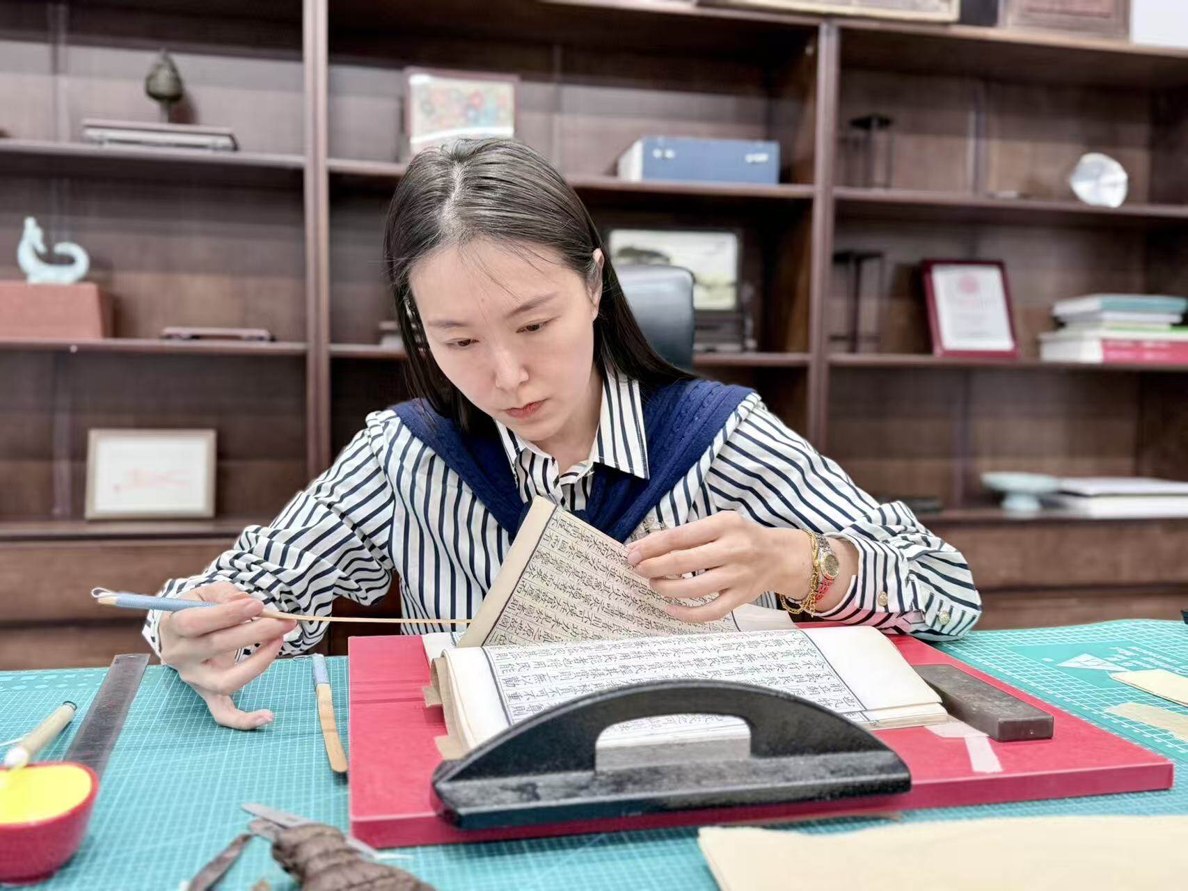 冯若群是科班出身,大学时报考的是文物鉴赏与修复专业。在系统性的理论学习中,她对古籍修复产生了浓厚的兴趣。“我从小就喜欢做手工,性格也比较安静,大学时期接触到古籍修复后就特别喜欢。”在她看来,这份需要极强耐心和定力的工作,恰好与自己沉静的性格天然契合。