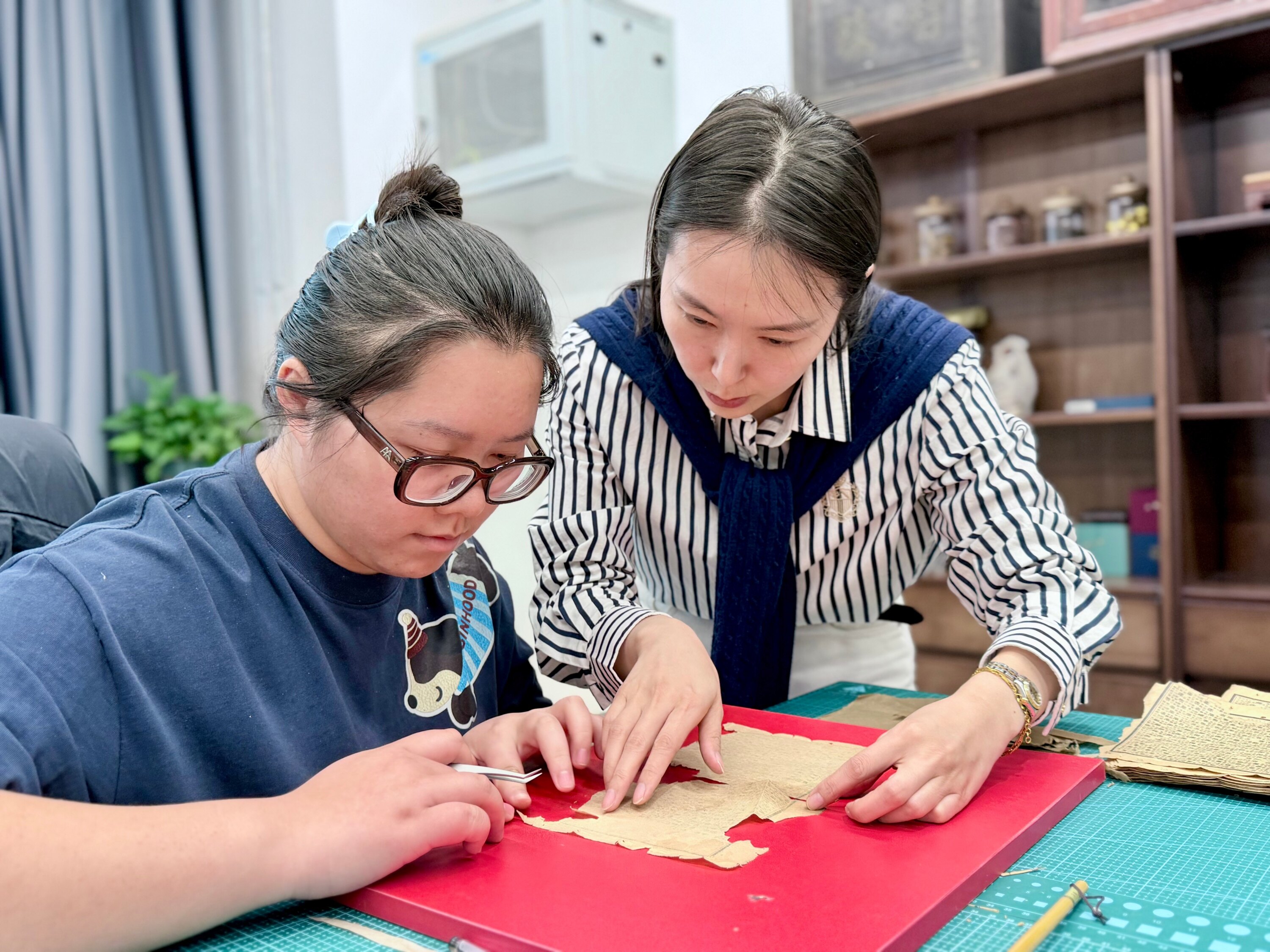 刘诗雯跟随冯若群学习已近两年,如今已能独立完成一本古籍的修复工作。看着徒弟的成长,冯若群眼中满是欣慰:“刚开始学的时候,她一坐就是一整天。现在她进步非常大,悟性也高。这两年看着她一点点成长起来,就像看到了当年的自己。”谈及古籍修复时,刘诗雯眼神笃定:“我希望能一直做下去。”