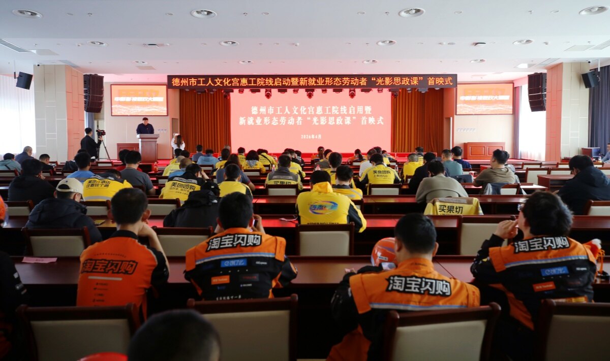 德州晚报全媒体讯 4月14日,德州市工人文化宫惠工院线启用暨新就业形态劳动者“光影思政课”首映式顺利举行。100余名快递员、网约配送员、网约车司机、电商从业者等新就业形态劳动者参加活动。本次活动由德州市工人文化宫、德州市新业态工会联合会联合主办,设置读书交流、启动仪式、主题观影三个环节,以“阅读 + 观影”形式开展思政教育,传递工会“娘家人”的温暖关怀。