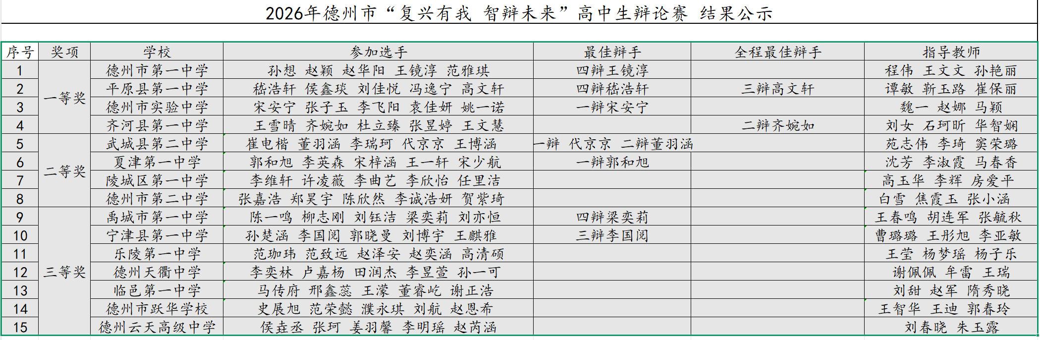 经过两天的激烈比拼,德州市第一中学、平原县第一中学、德州市实验中学、齐河县第一中学四所学校荣获一等奖。王镜淳、嵇浩轩、宋安宁、代京京、董羽涵、郭和旭、梁奕莉、李国阅8名同学获评“最佳辩手”,高文轩、齐婉如两位同学荣获“全程最佳辩手”称号。