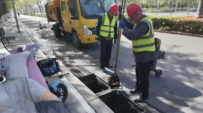 在作业现场,一线养护人员严格落实安全规范,采用“机械+人工”协同作业。主次干道上,专业清淤车辆对管网进行高压冲刷,效率惊人;背街小巷里,工人们则用简易工具配合人工清掏,一点一点把淤泥和杂物挖出来。